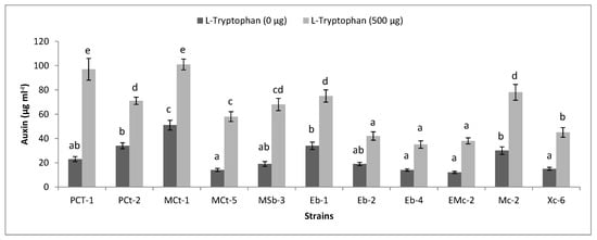 Auxin production by some representative purified bacterial strains in the presence and absence of L-tryptophan. Strains were grown in Luria–Bertani broth (L-broth) at 37 °C for 72 h. Bar represents the mean ± S.E. of three replicates. Different letters on bars indicate significant differences between respective treatments using Duncan’s multiple range test (p ≤ 0.05).
