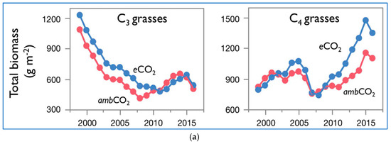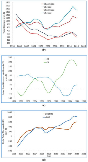 Figure 2a presents the biomass over time of C3 grasses and C4 grasses of [3] at ambient and elevated CO2. The data are shown as moving three-year averages centered over the middle of each three-year group. In Figure 2b–d their data of total biomass of both C3 and C4 plants vs. time is coupled together and further analyzed.
