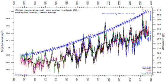 According to the latest estimations of the Intergovernmental Panel on Climate Change (IPCC) Fifth Assessment Report (www.ipcc.ch/assessment-report/ar5/), the long-term change in global temperature that would result from doubling the atmospheric CO2 concentration between 1.5 and 4.5 °C. Figure 3 is a graph of global temperature records, quality class 1 satellite records such as University of Alabama at Huntsville (UAH), USA, quality class 2 such as HadCRUT, a cooperative effort between the Hadley Centre for Climate Prediction and Research and the University of East Anglia’s Climatic Research Unit (CRU), UK, and quality class 3 records such as National Climatic Data Center (NCDC), USA and Goddard Institute for Space Studies (GISS), at Columbia University, New York City, USA, and the atmospheric CO2 measured at the Mauna Loa Observatory.