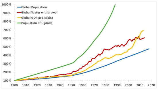Figure 4 presents global GDP pro-capita, water withdrawals and population, and population of Uganda from 1900 to present.