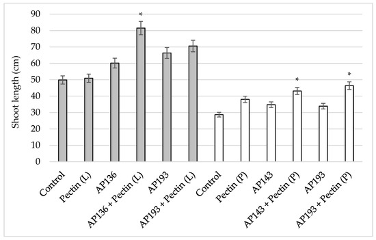 Effect of pectin powder or liquid suspension amendments on soybean shoot length by Bv PGPR strains at 35 DAP# in the greenhouse trials. The gray bar indicates amendment with 0.1% (w/v) pectin liquid suspension (L), while the white bar indicates amendment with the comparable amount of pectin powder (P) (* indicates significance at the 5% level relative to the Bv PGPR strains alone) (DAP#—days after planting).