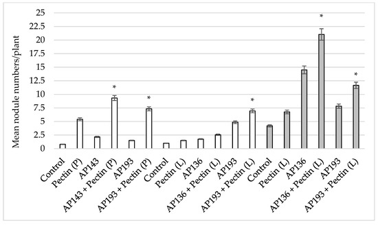Effect of pectin powder or liquid suspension amendments on soybean nodulation by Bv PGPR strains at 35 DAP# in the greenhouse and field trials. The gray-colored bar indicates the results of the field trial with a 0.1% (w/v) pectin liquid suspension, and the white-colored bar indicates greenhouse trials in which pectin was applied as a powder (P) or as a liquid suspension (L) amendment (* indicates significance at the 5% level relative to the Bv PGPR strains alone) (DAP#—days after planting).