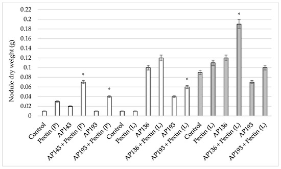 Effect of pectin powder or liquid suspension amendments on soybean dry nodule weight by Bv PGPR strains at 35 DAP# in the greenhouse and field trials. The gray-colored bar indicates the results of the field trial with a 0.1% (w/v) pectin liquid suspension, and the white-colored bar indicates greenhouse trials in which pectin was applied as a powder (P) or as a liquid suspension (L) amendment (* indicates significance at the 5% level relative to the Bv PGPR strains alone) (DAP#—days after planting).