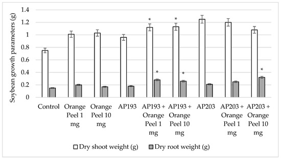 Effect of orange peel (OP) amendments on soybean dry shoot (white bar graph) and root weights (gray bar graph) by Bv PGPR strains at 35 DAP in the greenhouse tests (* indicates significance at the 5% level relative to the Bv PGPR strains alone) (DAP#—days after planting).
