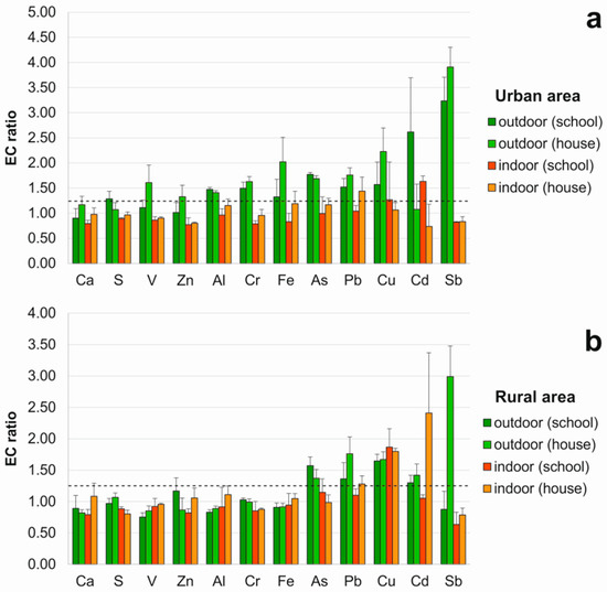 - Almeida, S.M.; Canha, N.; Silva, A.; do Carmo Freitas, M.; Pegas, P.; Alves, C.; Evtyugina, M.; Pio, C.A. Children exposure to atmospheric particles in indoor of Lisbon primary schools. Atmos. Environ. 2011, 45, 7594–7599. [Google Scholar] [CrossRef]