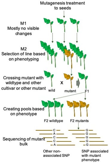 MutMap is a recently developed efficient and affordable forward genetic approach which is based on the high-throughput next-generation sequencing technique. MutMap has been demonstrated in rice for the first time to map mutations causing color change of leaves and semi-dwarf plant structure []. The major steps involved in the MutMap approach is illustrated in Figure 1. In a study conducted by [], a rice cultivar was chemically mutagenized to develop a mutant population. The mutant lines mostly carry recessive mutations and such mutations do not impact phenotypic alteration. Therefore, the mutant lines need to be self-pollinated to obtain homozygous mutant populations in subsequent generations. Then the mutants with recessive mutation need to be identified based on the phenotypic screening and crossed with the wild type of the same cultivar. The obtained F1 hybrid plants need to self-crossed to obtain F2 generation. Furthermore, the bulk DNA of F2 population can be sequenced and mapped with reference genome of wild-type cultivar to identify the SNPs and insertions-deletions putatively related to the phenotype []. Due to the high applicability and reduced sequencing cost, MutMap can be utilized to identify desired genes with agronomic importance in lesser time []. The MutMap technique has recently been used in tomato to map mutations induced in the Micro-Tom cultivars []. A segregating F2 population have been developed by crossing the homozygous mutant line with a wild Micro-Tom, and separate pools of plants showing mutant and wildtype phenotypes have been sequenced with the NGS method to map the causal mutation. This study has demonstrated that the mapping of causal mutation can be performed within ten to twelve months in tomato with affordable cost.