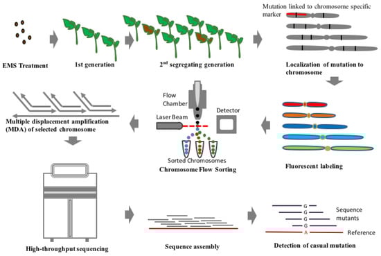 Finding a randomly induced mutation in a whole genome is like finding a needle in a haystack. However, with the advent of DNA sequencing, identifying genome-wide sequence variations has become easier. On the contrary, identification of sequence variation with high confidence using genome sequencing approach is easier only for plants with small genomes like Arabidopsis and rice while it is an expensive and computationally challenging approach for plants with larger genomes like barley and wheat. A recently discovered technique for rapid detection of casual mutation called MutChromSeq (Mutant Chromosome Sequencing) has been applied to identify novel genes in plants []. In this technique, classical mutagenesis is combined with chromosome flow sorting to filter out the desired region where we can find the desired gene. In this approach, the chromosomes are filtered out where particular gene is located on the basis of fluorescent marker tags (Figure 2). This is followed by sequencing of chromosomes of both mutant and non-mutants to find the desired gene of interest. This technique of isolating gene and DNA sequences can be applied to plants with complex and polyploidy genomes as well as genomes with large chromosome which are devoid of recombination and hence, reducing the need for recombination-based genetic mapping. This technique has been successfully employed in the case of barley and wheat for cloning of Eceriferum-q and Pm2 gene []. This technique is applied to plants which are responsive for mutagenesis, the desired mutation results in significantly visible phenotypic change and prior information of the chromosome where the gene is located is available. Hence, it can be an inexpensive and robust technique of cloning of known unmanageable genes []. There is not a single report on MutChromSeq analysis in tomato, but its diploid nature and the availability of whole genome sequence make it easier to implement this technique for isolating and cloning desired genes in future.