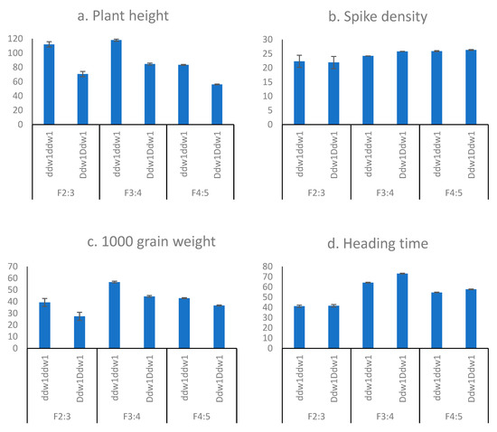 Agronomic traits in spring triticale population ‘Hongor’ × ’Dublet’ F2:3 and families F3:4 and F4:5 with ddw1ddw1 and Ddw1Ddw1 genotypes: (a) plant height (cm); (b) spike density; (c) 1000 grain weight (g); (d) heading time (days). Bars indicate LSD0.05.