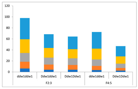Chart of internode length of the triticale plants in the greenhouse F2:3 and field F4:5 experiments. The colors of the charts stand for the following internodes: light blue, peduncle; violet, 2nd upper internode; green, 3rd upper internode; red, 2nd lower internode; and dark blue, 1st lower internode. Horizontal axis: 0, ddw1ddw1 genotype; 1, Ddw1ddw1 genotype; and 2, Ddw1Ddw1 genotype.
