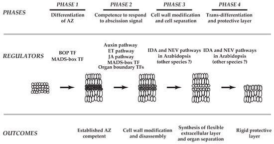 Biochemical changes required for clean separation obviously call for the hydrolysis of pectin and cellulose that unglue and loosen the middle lamella and primary cell wall, respectively [1,12,57]. In addition, a prerequisite for abscission to occur in response to abscission inducing signals like ethylene is a sensitization of the AZ cells resulting from a decline in auxin within the AZ [3,6,60,70]. As stated above, the working model for abscission consists of largely four basic phases [2,4,5,7,10,12,23,30,35,36,37]: first, differentiation of abscission zone (AZ); second, acquisition of the competence of the AZ to respond to abscission signals (e.g., decline in auxin); third, cell wall modification and cell separation; and fourth, trans-differentiation of the AZ and formation of a protective layer (Figure 1). Although this delineated model is instrumental to explain the culmination of organ separation in diverse abscission systems, as more data become available through high-throughput analyses, we are now beginning to understand more detailed biological processes that corroborate previous physiological and cytological observations [1,57].