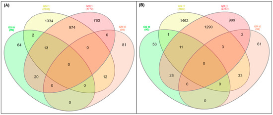 The differential expression results presented in a Venn diagram from transcriptome analysis in glyphosate-resistant (GR) and -sensitive (GS) biotypes of Conyza bonariensis in response to glyphosate treatment. (A) Up-regulated; (B) down-regulated. t0: without glyphosate treatment; t1: with glyphosate treatment—RNA was obtained from plants collected at several timepoints up to 288 h after treatment and pooled. Genes were filtered according to relative expression (count-number), p-value and false discovery rate (FDR) set at ≤0.001.