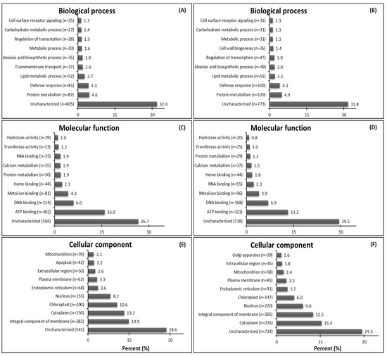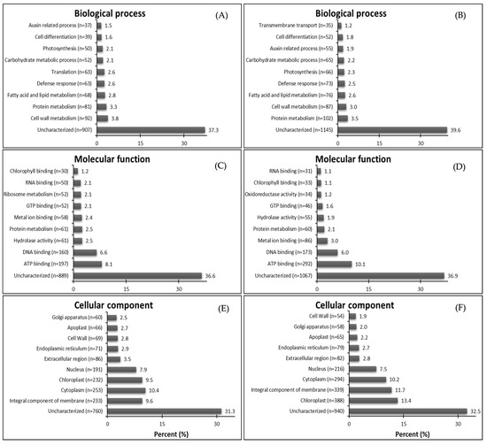 The attributed GO functions for down-regulated genes show the highest proportions of characterized genes respectively in GR and GS related to biological process—cell wall metabolism (3.8%) and protein metabolism (3.5%) (Figure 3A,B); molecular function—ATP binding for both biotypes (8.1% and 10.1%) (Figure 3C,D); and cellular component—integral component of membrane (9,6%) and chloroplast (13.4%) (Figure 3E,F). In the biological process, 63 genes related to translation were down-regulated in GR while just 16 in GS, which do not figure in the top ten in the sensitive biotype. Further, the transmembrane transport-related contigs were not among the top ten down-regulated DEGs in GR but were so in GS (Figure 3A,B). In molecular function, there were 52 down-regulated genes related to ribosome metabolism in GR while just one in GS (Figure 3C,D). Further, GR presented 40% and 31% less down-regulated genes related to chloroplast and integral component of the membrane than GS (Figure 3E,F).