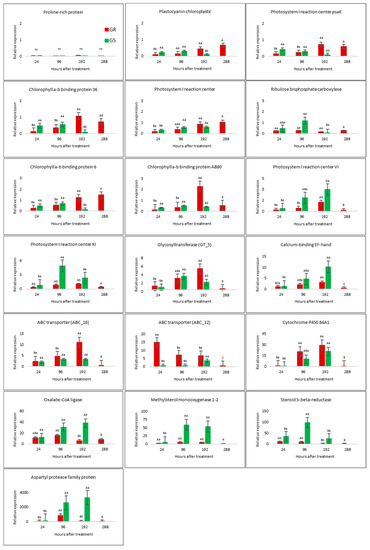 Relative expression levels of 19 selected genes in leaves of C. bonariensis glyphosate-resistant (GR—red bars) and -sensitive (GS—green bars) biotypes in a time-course experiment after glyphosate treatment relative to an internal control hexosyltransferase gene expression in the untreated plants using real-time RT-PCR (2−△△Ct). Results were compared by contrasts (p ≤ 0.05), and upper-case letters indicate comparisons of each biotype in different times and lower-case letters between biotypes in each respective time.