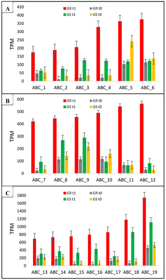 C. bonariensis transcriptome expression analysis (transcript reads per million mapped reads—TPM) of the 19 ABC transporters genes (1 to 19). GR: glyphosate-resistant biotype; GS: glyphosate-sensitive biotype. t0: without glyphosate treatment; t1: with glyphosate treatment—RNA was obtained from plants collected at several timepoints up to 288 h after treatment and pooled. Intervals indicate the standard error. In ABC_12 (ABC transporter C family member 14) and ABC_14 (ABC transporter C family member 9), the qRT-PCR analysis was performed (see Figure 4). The phylogenetic tree of these genes is presented in Figure S10.
