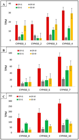 C. bonariensis transcriptome expression analysis (transcript reads per million mapped reads—TPM) of the 10 CYP450 genes (1 to 10). GR: glyphosate-resistant biotype; GS: glyphosate-sensitive biotype. t0: without glyphosate treatment; t1: with glyphosate treatment—RNA was obtained from plants collected at several timepoints up to 288 h after treatment and pooled. Intervals indicate the standard error. The phylogenetic tree of these genes is presented in Figure S10.