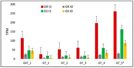 C. bonariensis transcriptome expression analysis (transcript reads per million mapped reads—TPM) of a glutathione (GST) and five glycosyltransferase (GT) genes. GR: glyphosate-resistant biotype; GS: glyphosate-sensitive biotype. t0: without glyphosate treatment; t1: with glyphosate treatment—RNA was obtained from plants collected at several timepoints up to 288 h after treatment and pooled; * indicates that was performed qRT-PCR analysis in that specific contig (See Figure 4). Intervals indicate the standard error.