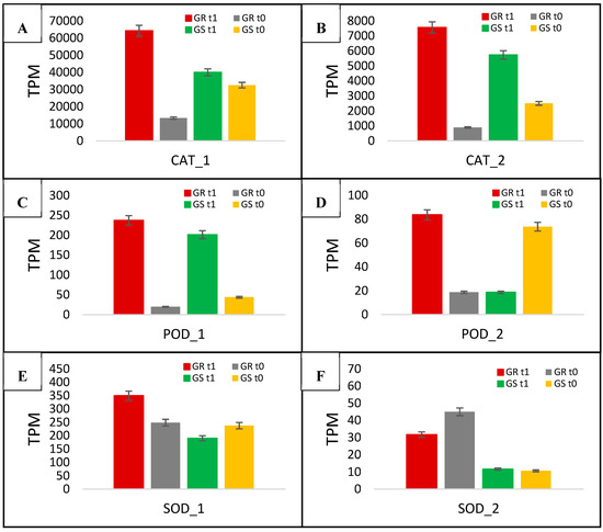 C. bonariensis transcriptome expression analysis (transcript reads per million mapped reads—TPM) of a two catalase (CAT—A and B), Peroxidase (POD—C and D), and superoxide dismutase (SOD—E and F) genes. GR: glyphosate-resistant biotype; GS: glyphosate-sensitive biotype. t0: without glyphosate treatment; t1: with glyphosate treatment—RNA was obtained from plants collected at several timepoints up to 288 h after treatment and pooled. Intervals indicate the standard error.