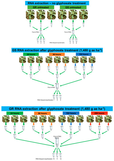 Experimental design for RNA extraction and RNA-Seq experiment in Conyza bonariensis glyphosate-resistant (GR) and -sensitive (GS) biotypes with (t1) and without (t0) glyphosate treatment. RNA samples 1–3: GR t0—untreated; RNA samples 4–6: GS t0—untreated; RNA samples 7–9: GS t1—RNA samples extracted at 24, 96, and 192 h after glyphosate treatment; RNA samples 10–12: GR t1—RNA extracted at 24, 96, 192, and 288 h after glyphosate treatment. RNA was extracted from a total of 27 plants and pooled according to each treatment. Three technical replicates were sequenced from each treatment (GR t0, GS t0, GS t1, and GR t1—a total of 12 libraries). Glyphosate rate of 1480 g ae ha−1.