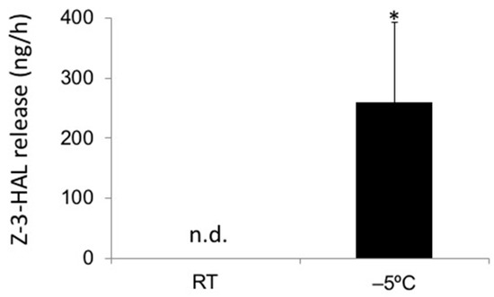 Nearly all plants release GLVs when mechanically damaged. However, most if not all of these studies were performed at RT. As cold stress can also inflict significant damage, we wanted to test if plants damaged by cold stress also release significant amounts of these compounds. To ensure damage, we placed maize seedlings in a chamber at −5 °C for 1 h, and collected volatiles over this time. The controls were kept at RT (26 °C). Over the collection period, we found that cold damaged maize seedlings released on average 258.1 ± 135.1 ng Z-3-HAL per hour per plant (Figure 1). We were not able to detect any significant amount of other GLVs under those conditions. This clearly shows that even during severe cold, the plants that sustained significant damage may still release substantial amounts of GLVs, in particular Z-3-HAL, making cold-stressed plants very capable of signaling damage to other plants nearby.