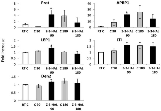 At this time point, the maize seedlings were already 120 min at 4 °C. There was no significant difference in the transcript levels of all of the selected genes 180 min after Z-3-HAL (210 min at 4 °C), however, the Z-3-HAL-treated maize seedlings appear to show a tendency for an earlier reduction in transcript accumulation than their respective controls.