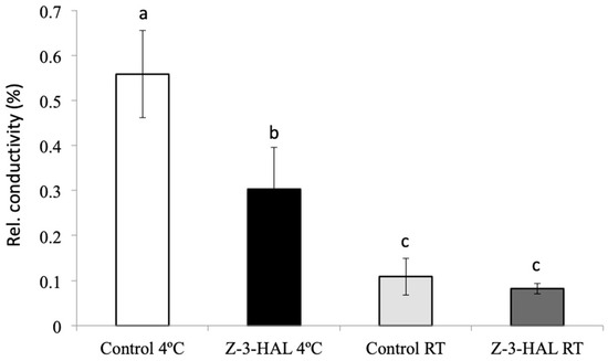 The effect of in-cold (Z)-3-hexen-1-al (Z-3-HAL) treatment on cold stress related ion leakage in maize (Zea mays) seedlings (n = 6). The relative conductivity is expressed as the ratio between ion leakage after short cold stress, divided by the total ion leakage after overnight freezing and thawing. The values are means ± SD, and different letters indicate significant differences between the treated and untreated seedlings (ANOVA, p < 0.05).