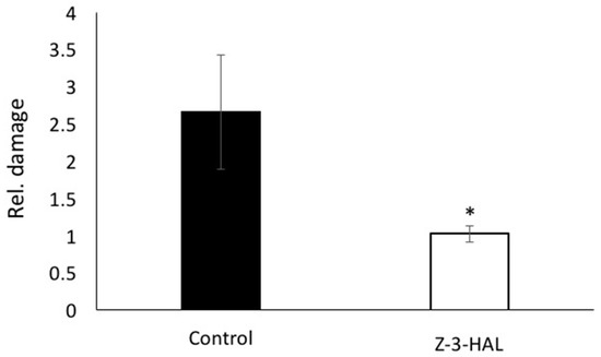 The effect of in-cold (Z)-3-hexen-1-al (Z-3-HAL) treatment on damage in maize (Zea mays) seedlings. Assessment of damage on a scale from 0 (no damage) to 4 (dead). The values are means ± SD, and the asterisks indicate significant differences between the treated and untreated seedlings (Students t-test, p < 0.05).