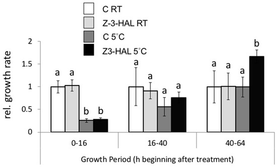 The growth response of in-cold (Z)-3-hexen-1-al (Z-3-HAL) and untreated maize (Zea mays) seedlings (n = 6) after 16 h at 5 °C and at room temperature (RT). Growth is expressed in relative units, with the RT control plants set at 100% for the observed growth period. The values are means ± SD, and the different letters indicate significant differences (ANOVA, p < 0.05).