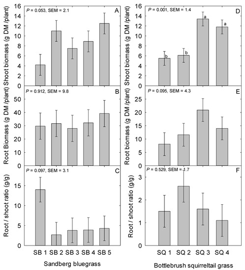 Figure 1. Mean shoot biomass dry matter (DM) grams per plant (A,D), root biomass DM grams per plant (B,E), root-to-shoot (gram root per gram shoot biomass DM) biomass ratio (C,F) of Sandberg bluegrass and Bottlebrush squirreltail populations evaluated under greenhouse conditions during 2015 to 2016 at the University of Nevada, Reno, USA. SB 1; Button Point (LP), SB 2; Panther Valley (LP), SB 3; Winnemucca Mountain (LP), SB 4; Hanford (CV), SB 5; Mountain Home (CV), and Bottlebrush squirreltail, SQ 1; George St. Sonoma (LP), SQ 2; Grass Valley (LP), SQ 3; Toe Jam Creek (CV), and SQ 4; Vale (CV). LP; local population, and CV; cultivar. Bars with same lowercase letters are not different (P > 0.05).