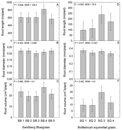 Figure 2. Mean (A,D) total root length in meters, (B,E) root diameter in millimeters, (C,F) root volume in cubic centimeters per plant of Sandberg bluegrass and Bottlebrush squirreltail evaluated under greenhouse conditions during 2015 to 2016 at the University of Nevada, Reno, USA. SB 1; Button Point (LP), SB 2; Panther Valley (LP), SB 3; Winnemucca Mountain (LP), SB 4; Hanford (CV), SB 5; Mountain Home (CV), and Bottlebrush squirreltail, SQ 1; George St. Sonoma (LP), SQ 2; Grass Valley (LP), SQ 3; Toe Jam Creek (CV), and SQ 4; Vale (CV). LP; local population, and CV; cultivar.
