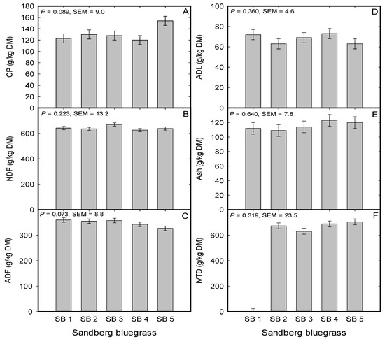 Figure 3. Mean (A) crude protein (CP), (B) neutral detergent fiber (NDF), (C) acid detergent fiber (ADF), (D) acid detergent lignin (ADL), (E) ash, and (F) in vitro true digestibility of Sandberg Bluegrass (expressed in gram per kilogram of dry matter (DM)) evaluated under greenhouse conditions during 2015 to 2016 at the University of Nevada, Reno, USA. SB 1; Button Point (LP), SB 2; Panther Valley (LP), SB 3; Winnemucca Mountain (LP), SB 4; Hanford (CV), SB 5; Mountain Home (CV). LP; local population, and CV; cultivar.
