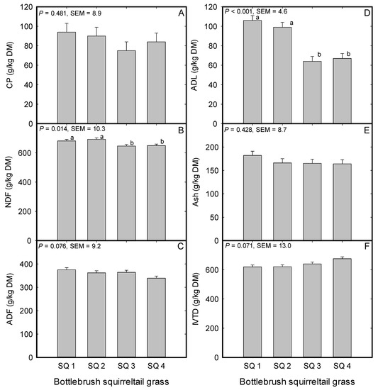 Figure 4. Mean (A) crude protein (CP), (B) neutral detergent fiber (NDF), (C) acid detergent fiber (ADF), (D) acid detergent lignin (ADL), (E) ash, and (F) in vitro true digestibility of Bottlebrush squirreltail (expressed in gram per kilogram of dry matter (DM)) evaluated under greenhouse conditions during 2015 to 2016 at the University of Nevada, Reno, USA. SQ 1; George St. Sonoma (LP), SQ 2; Grass Valley (LP), SQ 3; Toe Jam Creek (CV), and SQ 4; Vale (CV). LP; local population, and CV; cultivar. Bars with same lowercase letters are not different (P > 0.05).