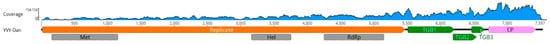 Schematic representation of the genome organization of yam virus Y isolate Danicha (YVY-Dan). Five predicted open reading frames (ORFs) are shown: ORF1 = replicase (orange); ORF2, ORF3, and ORF4 = triple gene blocks (TGB) 1, 2, and 3, respectively (green); ORF 5 = coat protein (CP) (pink). Conserved motifs for viral methyltransferase (Met, pfam 01660), viral helicase_1 (Hel, pfam 01443), RNA-dependent RNA polymerase_2 (RdRp, pfam 00978) are shown in grey. A graphic coverage plot spanning the entire sequence is shown above the YVY-Dan genome.