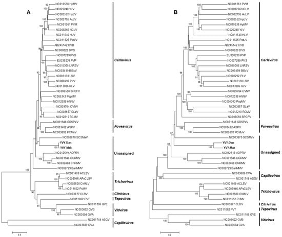 Phylogenetic trees based on (A) the amino acid sequences of the entire replicase protein and (B) full-genome sequences of YVY-Dan and YVY-Mak and members of the family Betaflexiviridae. Bootstrap analysis was performed with 1000 replicates and the cut-off value was 85%. The scale bar represents the number of amino acid and nucleotide substitutions per site. YVY-Dan and YVY-Mak are indicated in bold.