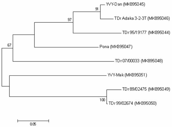 Maximum likelihood phylogenetic tree based on the nucleotide sequences of the CP gene of YVY isolates. GenBank accession numbers are in brackets. These sequences were obtained from yam accessions growing in a quarantine aphid-proof glasshouse at NRI, United Kingdom (YVY-Dan; TDr 95/19177; Pona; TDr 07/00033; YVY-Mak; TDr 89/02475; TDr 99/02674) and IITA, Nigeria (TDr Adaka 3-2-3T). Bootstrap analysis was performed with 1000 replicates and the cut-off value was 65%. The scale bar represents the number of nucleotide substitutions per site.