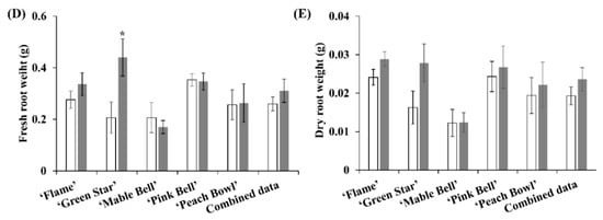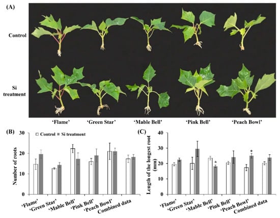 The root development (A), number of roots (B), length of the longest root (C), fresh root weight (D), and dry root weight (E) of the control and Si-treated poinsettia cultivars. Data were represented by the mean ± SE (bars). Combined data is the average value of all the cultivars. Asterisks represent significant differences between control and Si treatment according to Student’s t-test (P ≤ 0.05).