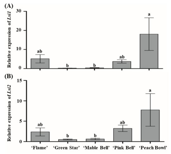 As Si accumulation is significantly different among the cultivars, even without Si supplementation, and as Si uptake is affected by Si transporter genes, the expression of Lsi1 and Lsi2 was investigated in the roots of the poinsettia cultivars. The results illustrated that the expression of Si transporter genes was greatly different among the poinsettia cultivars (Figure 3A,B). Both Lsi1 and Lsi2 were highly expressed in ‘Peach Bowl’, while they were lowly expressed in ‘Mable Bell’ and ‘Green Star’.