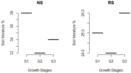 Soil moisture content in non-stress (NS) and drought stress (RS) plot. S1: Early reproductive, S2: Reproductive, S3: Maturity.