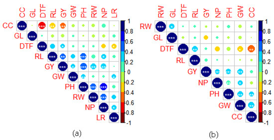 Correlation matrix of traits evaluated. (a) MRQ74 pyramided lines (PLs) under RS, (b) MRQ74 PLs under NS, Days to 50% flowering (DTF), plant height (PH) in cm, number of panicles (NP), chlorophyll content (CC), leaf rolling (LR), root weight (RW) in g, root length (RL) in cm, grain weight (GW) in g, grain length (GL) in cm, grain yield (GY) in kg ha−1. * p < 0.05, ** p < 0.01, ** p < 0.001.