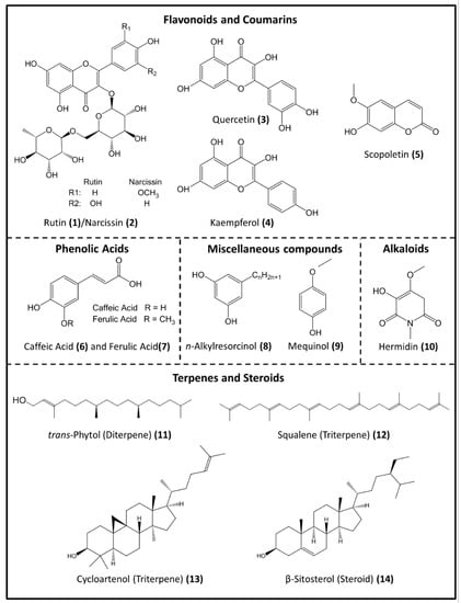 - Ostrozhenkova, E.; Eylert, E.; Schramek, N.; Golan-Goldhirsh, A.; Bacher, A.; Eisenreich, W. Biosynthesis of the chromogen hermidin from Mercurialis annua L. Phytochemistry 2007, 68, 2816–2824. [Google Scholar] [CrossRef] [PubMed]