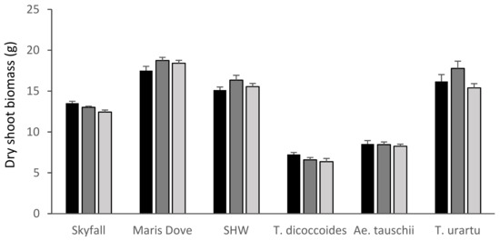 Mean shoot biomass by species and treatment. Skyfall: T. aestivum ‘Skyfall’, Maris Dove: T. aestivum ‘Maris Dove’, SHW: Synthetic Hexaploid Wheat. Low/30 ppb: black bars; medium/55 ppb: dark grey bars; high/110 ppb: light grey bars. Bars show standard errors (n = 6).