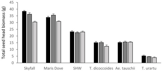 Mean total seed head biomass. Skyfall: T. aestivum ‘Skyfall’, Maris Dove: T. aestivum ‘Maris Dove’, SHW: Synthetic Hexaploid Wheat. Low/30 ppb: black bars; medium/55 ppb: dark grey bars; high/110 ppb: light grey bars. Bars show standard errors (n = 6).