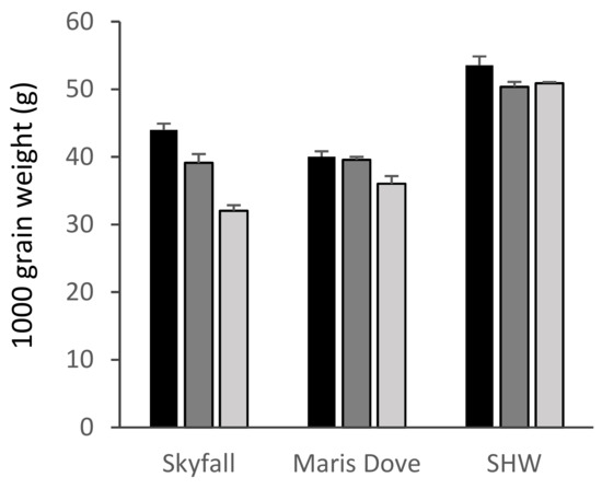 1000 grain weight of cultivar and synthetic wheat. Skyfall: T. aestivum ‘Skyfall’, Maris Dove: T. aestivum ‘Maris Dove’, SHW: Synthetic Hexaploid Wheat. Low/30 ppb: black bars; medium/55 ppb: dark grey bars; high/110 ppb: light grey bars. Bars show standard errors (n = 6).