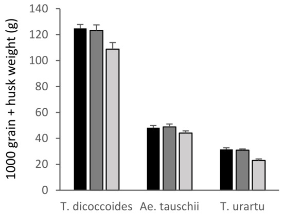 1000 grain + husk weight of the wild relatives of wheat. Low/30 ppb: black bars; medium/55 ppb: dark grey bars; high/110 ppb: light grey bars. Bars show standard errors (n = 6).