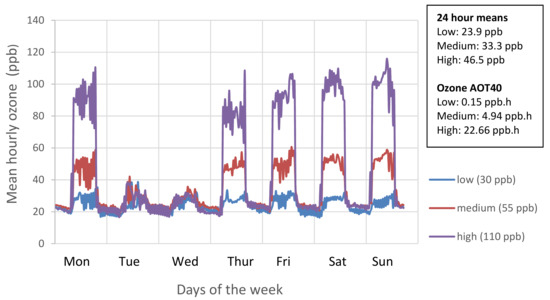 The replicates were distributed randomly within four hemispherical glasshouses (solardomes; 2.1 m high; 3 m diameter). Ozone treatments started on 7th June and continued for 11 weeks until all plants had been harvested (21 August). Using square wave exposures to the maximum levels, ozone concentrations in each solardome provided low (30 ppb), medium (55 ppb), and high (110 ppb) regimes (Figure 6 and Figure S1), with concentrations reduced at night-time and on two days each week, to reflect natural patterns of ozone exposure. Plants were rotated within the solardomes weekly, and once (20 June) between the four solardomes; environmental conditions were found not to vary between the solardomes [58].