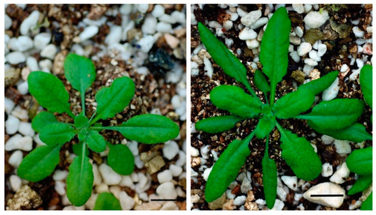 NO2 concentration effect on the yield of shoot biomass in 4-week-old plants was first determined. Shoot biomass of +NO2-treated C24 plants under 10 ± 0.2 and 50 ± 0.3 ppb NO2 was 3.2-fold [29] and 2.5-fold greater relative to the –NO2 control plants. Treatments of 100 ± 20 and 200 ± 50 ppb NO2 produced no stimulation of growth, or somewhat repressed the growth of plants. In this study, 50 ± 0.3 ppb NO2 treatments were used. Images of typical 4-week-old + NO2 and –NO2 control plants (Columbia) are shown in Figure 1.