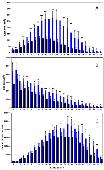 Microscopic study was performed according to Tsuge et al. (1996) [42]. The leaves of Arabidopsis C24 plants were fixed with a FAA solution (formaldehyde-acetic acid-ethanol), and microscopic observations were carried using a stereo microscope and a differential interference microscope. Microphotographs were taken to measure leaf area, cell number, and cell size (Figure 2). Leaves 1 (the oldest) to 25 (the youngest) in +NO2-treated plants had 1.3–8.4 times greater leaf areas compared with –NO2 control plants in the corresponding leaf positions (Figure 2A). The observed differences were significant statistically at all positions according to the Student’s t-test (Figure 2A) [25].