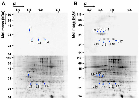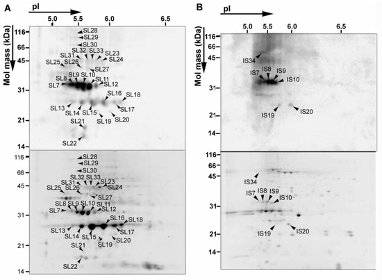 The 2D PAGE images of whole leaf proteins and chloroplast proteins are shown in Figure 3 and Figure 4, respectively. The relative intensities of spots on Western blots (abbreviated as RISI), and those of the spots on SYPRO Ruby gels (abbreviated as RISS) were determined. Nitrated proteins identified in chloroplast protein fractions and their electrophoretic and proteomic characteristics are summarized in Table S3. Proteins that showed a high RISI and/or a high RISI/RISS were concluded to be selectively nitrated [57]. Seven 3-NT-positive spots were detected on a Western blot of whole leaf proteins from exposed leaves (Figure 3), all of which were identified as PsbO1, PsbO2 or PsbP1 by peptide mass fingerprinting (PMF) [57].