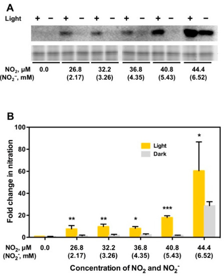 A distinct 3-NT-positive band of 32.5 kDa was detected on a Western blot of proteins extracted from thylakoid membranes that were incubated in a buffer containing NO2 and NO2− under illumination (Figure 5A). This band was assigned to PsbO1 by liquid chromatography/mass spectrometry (LC/MS), followed by a Mascot search analysis [64]. On the other hand, no such band was detected following incubation thylakoid membranes in the same buffer in the dark at all concentrations of NO2 and NO2− (Figure 5). Thus, illumination is essential in NO2/NO2−-mediated protein nitration. The intensities of the PsbO1 band on the Western blots were quantified using PDQuest software (ver. 7.0; Bio-Rad, Hercules, CA, USA) [64]. The intensity of the 3-NT-positive PsbO1 band after incubation in a buffer containing NO2 and NO2− was divided by the intensity of the 3-NT-positive PsbO1 band before incubation in the buffer. This value was designated fold-change in the PsbO1 band intensity, and plotted against the concentrations of NO2 and NO2– (Figure 5B). Incubation in the dark resulted null intensity of PsbO1 band at all concentrations of NO2 and NO2–except 44.4 μM NO2 and 6.52 mM NO2− (Figure 5). This confirms that illumination is essential in NO2/NO2–-mediated protein nitration of PsbO1 in Arabidopsis thylakoid membranes.