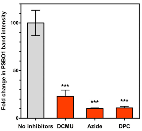 Thylakoid membranes were incubated in a buffer containing NO2 and NO2− in the presence or absence of electron transport inhibitors such as 3-(3,4-dichlorophenyl)-1,1-dimethylurea (DCMU), sodium azide and 1,5-diphenylcarbazide (DPC). Proteins were extracted from the treated thylakoid membranes, nitration of PsbO1 was determined by quantification of intensity of PsbO1 band. The results are shown in Figure 6. Fold-change in PsbO1 band intensity is given by (intensity of PSBO1 band after incubation in a buffer containing NO2 and NO2−)/(intensity of PSBO1 band before incubation in the buffer). DCMU inhibits the photosynthetic electron transport by inhibiting binding of plastoquinone [68], and decreased the fold-change in PsbO1 band intensity to about one-fifth of the control value (Figure 6). Azide inhibits the photosynthetic electron transport by inhibiting a variety of reactions, including oxidation of water [69]. Azide also decreased the fold-change in PsbO1 band intensity to one-tenth of the control value (Figure 6). DPC inhibits the photosynthetic electron transport by inhibiting photosynthetic electron flow [70]. DPC decreased the fold-change in PsbO1 band intensity to one-tenth of the control value (Figure 6). Our present findings that nitration of PsbO1 was substantially inhibited by photosynthetic electron transport inhibitors substantiate our postulated nitration mechanism, whereby nitratable tyrosine residue of PsbO1 undergoes one-electron oxidation to tyrosyl radical that is highly reactive with NO2 under illumination through PSII photosynthetic electron transport.