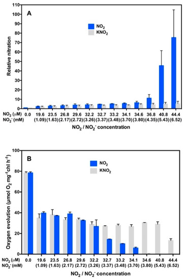 We next investigated oxygen evolution from isolated thylakoid membranes that had been treated or not treated with a buffer containing NO2 and NO2− [71]. This buffer contained NO2 and NO2− as nitrating agent [61]. As it is reported that nitrite anion inhibits PSII to decrease oxygen evolution [72,73,74], it is necessary to separately evaluate these two effects of nitrite on the oxygen evolution. Thylakoid membranes isolated from Arabidopsis leaves were incubated in a buffer containing NO2 and NO2− or a buffer containing NO2− alone in the light or in the dark [71]. After incubation, each of the treated thylakoid membrane samples was divided into two portions. The first portion was analyzed for nitration of PsbO1 by Western blotting using 3-NT-specific antibody. The intensity of the 3-NT-positive PsbO1 band was quantified. Using the second portion, oxygen evolution was quantified [71]. Results are shown in Figure 7.